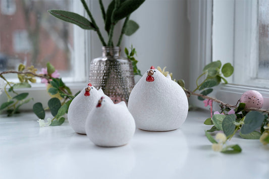 En anden klassiker inden for påskepynt er påskeharer. De fine figurer bringer straks et smil frem hos både børn og voksne, og påskeharerne findes i et utal af størrelser og udtryk. Placer haren ved siden af en kurv fyldt med chokoladeæg eller som dekoration på påskebordet. Se alle vores påskeharer her.
