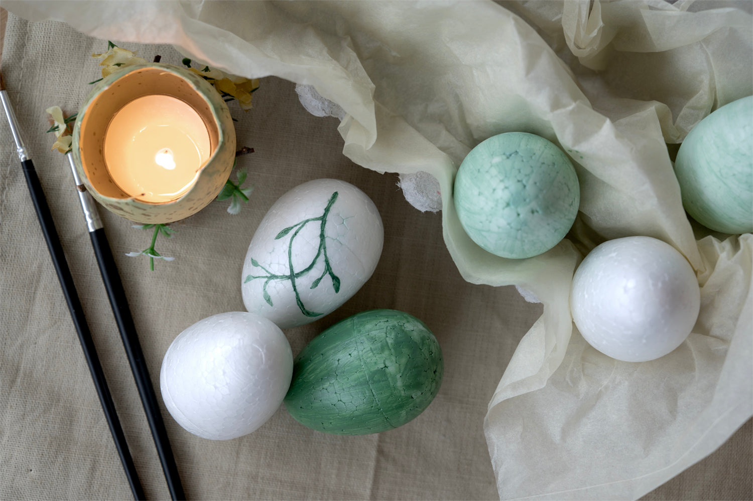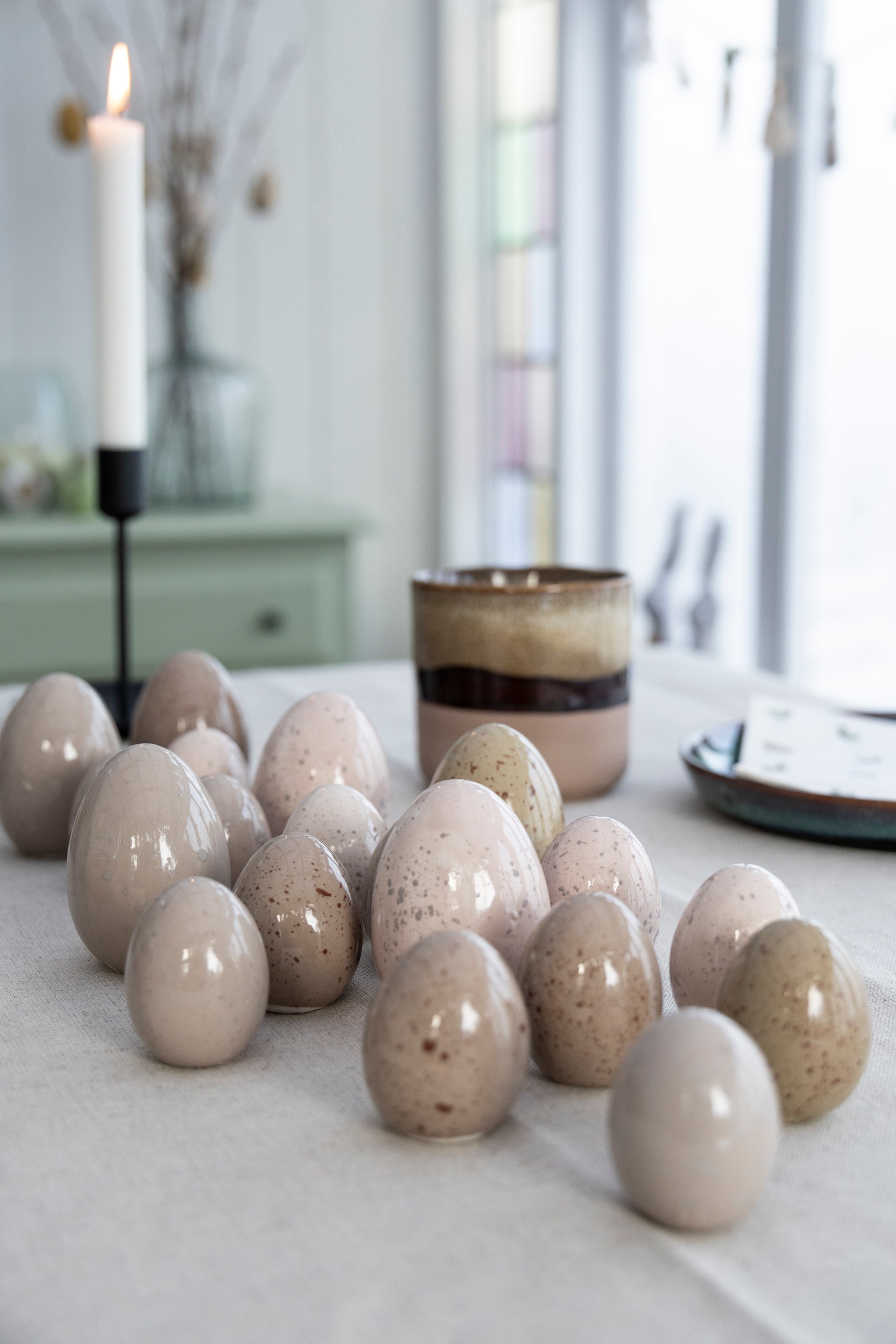 Dekorative påskeæg er ikke kun til bordet. Brug dem til at skabe hyggelige nicher i hjemmet. Læg dem i skåle på sofabordet, stil dem på hylder, i vindueskarme eller brug dem som del af en forårsinspireret dekoration.